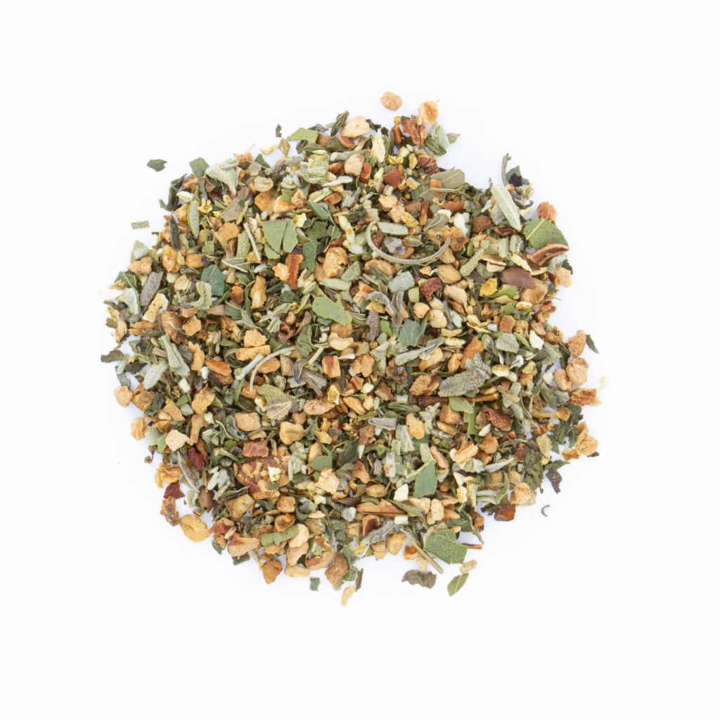 Morceaux de pomme* et de gingembre*, écorce d'orange*, menthe poivrée*, feuilles d'eucalyptus* et de sauge*, fleurs de sureau*.