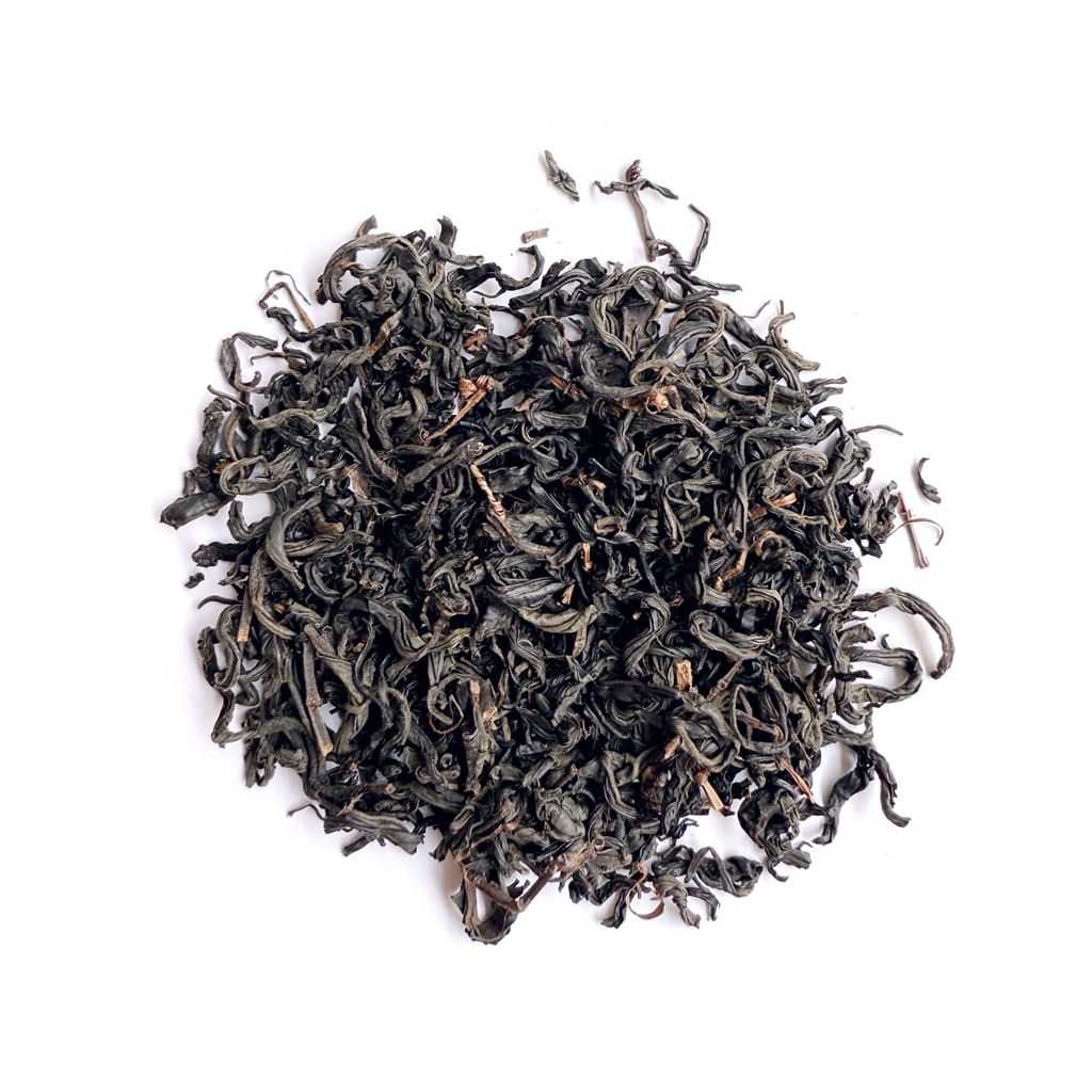 Délicieux thé noir de l'île de Jeju en Corée aux grandes feuilles et bourgeons bouclés.